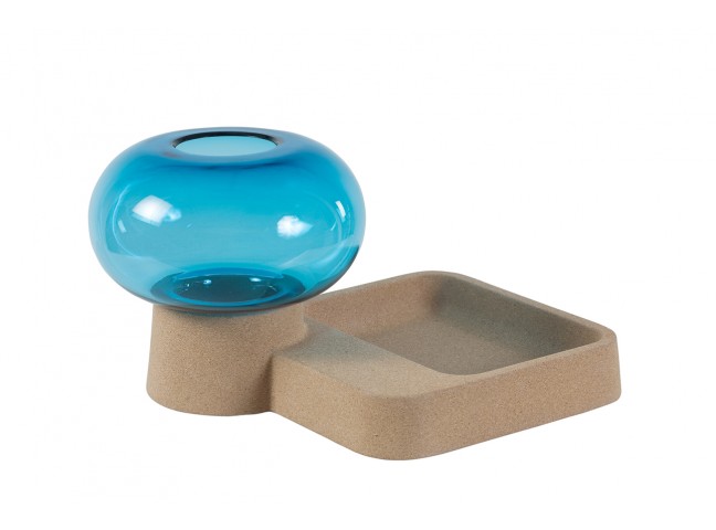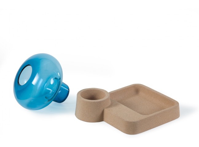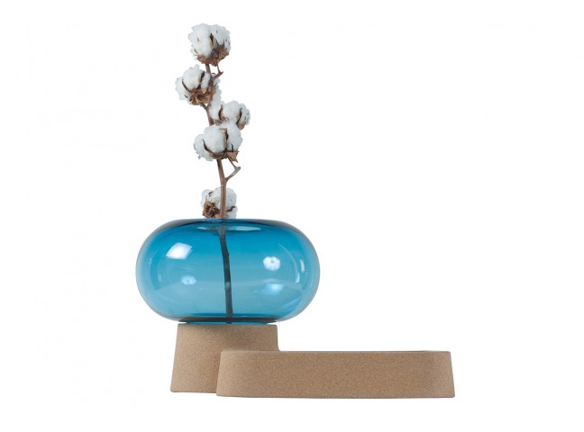 Deneb is a stylish. limited edition vase designed by Guillaume Delvigne. It features a blue, blown glass vase anchored in a tray made from cork. The catch-all tray also acts as the vase’s base.