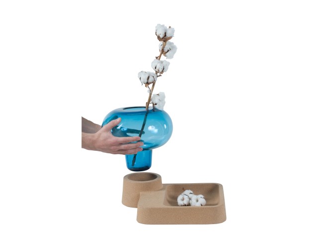 “Deneb is a true functional and formal paradox. A vase separable from its base, but useless without it. Cork, traditionally considered a poor material, takes center stage, enhanced by the hands of a craftsman. Between the coolness of glass and the softness of cork, turquoise blue sparkles like a star whose name it bears."