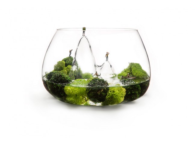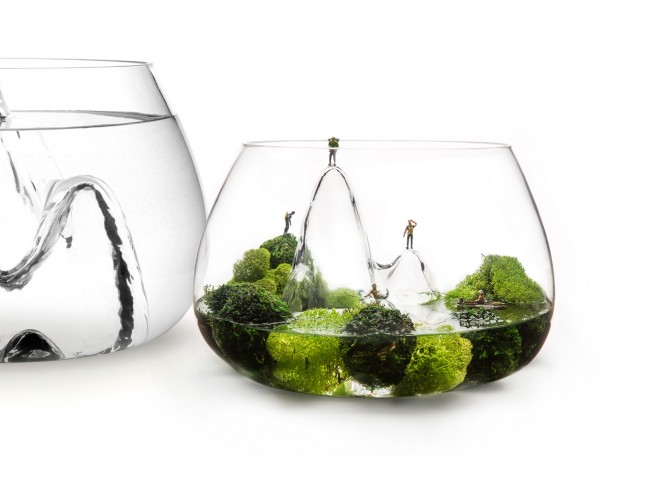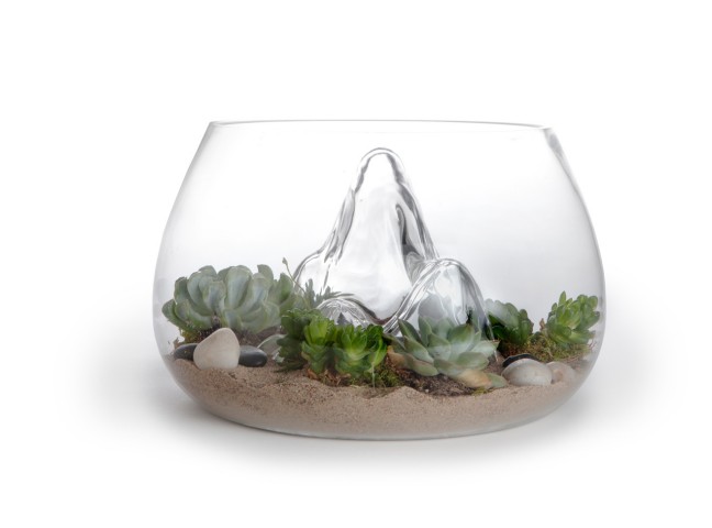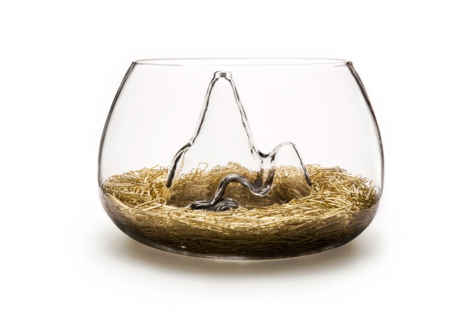 Handmade glass bowl with textured interior landscape.