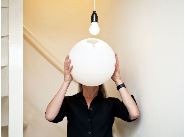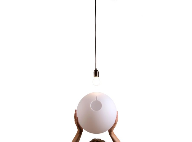 A perfect tiny chandelier suspended inside a black glass pendant.