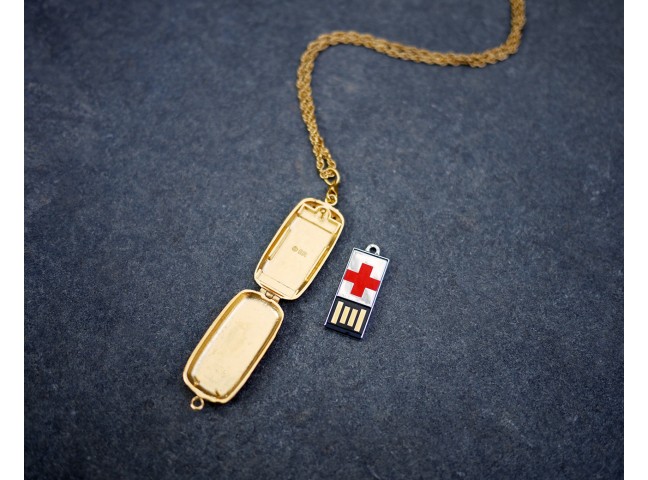Medical Locket has an Asclepius, the symbolic serpent entwined around a staff, on the front and a Red Cross on the flash drive. Contains a 2GB USB flash drive which enables the user to easily store and maintain a more complete and up to date medical history, as well as contact information of loved ones.