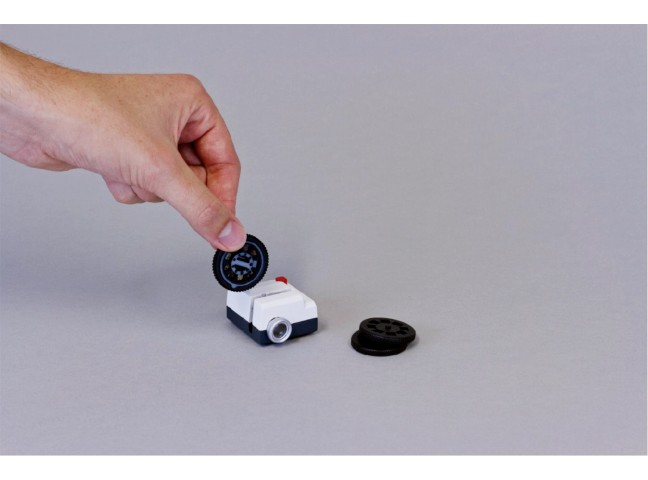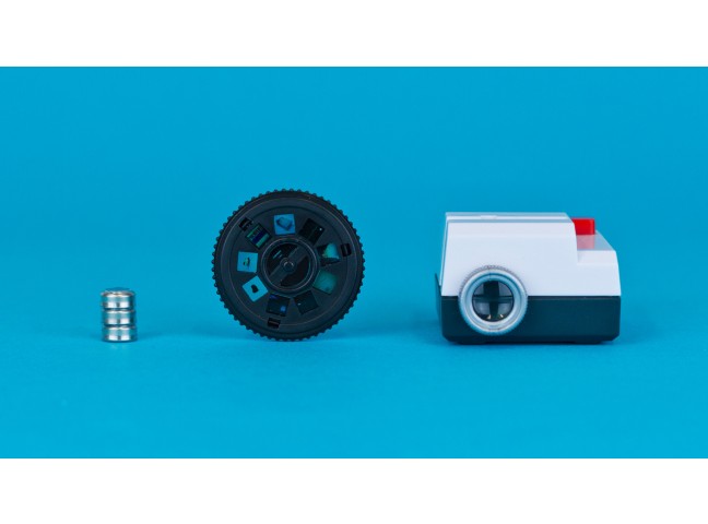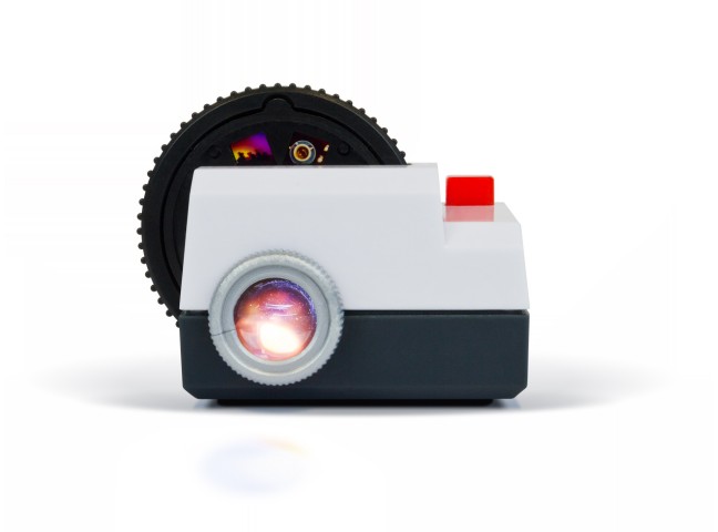 The tiny projector uses an internal LED to display photos, which have been developed onto 35mm Kodak film, and cut into custom slide wheels that each hold 9 of your favorite Instagram images. Additional wheels are also available.