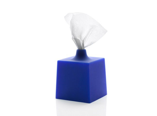 A clean, modern tissue box cover in white, black, red, blue and orange.