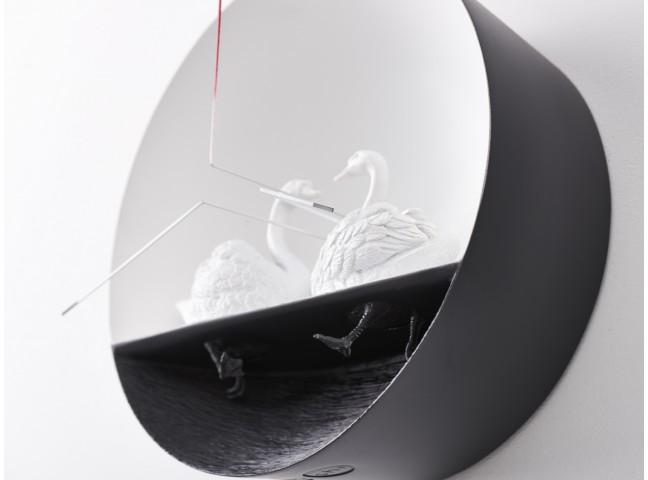 Part clock, part art piece, Waterbird Clock hangs on the wall like a little window showing a surreal nature scene.