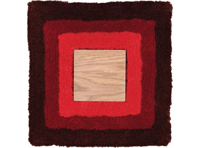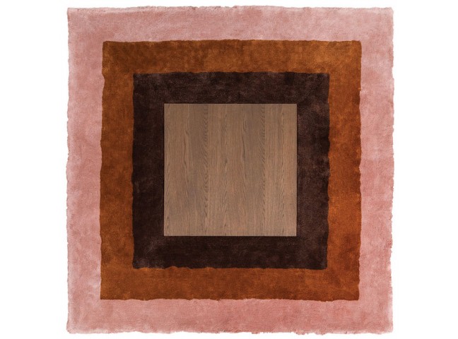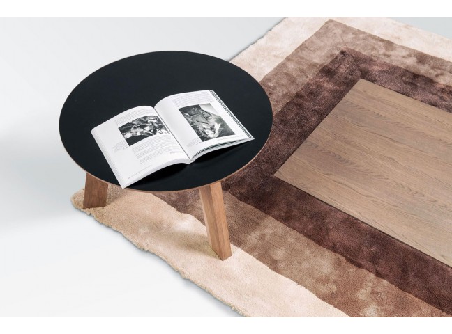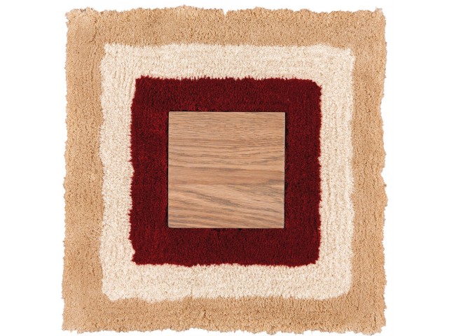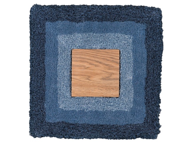 Design Studio Why Not's Woody Rug is made of soft, comfortable linen with an integrated wooden board, that you can put stuff on, in the center. The geometric design is a nod to Japanese culture.