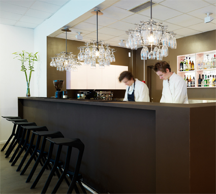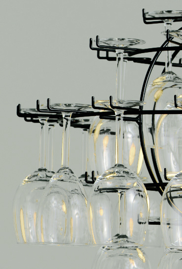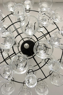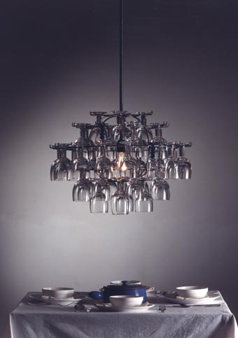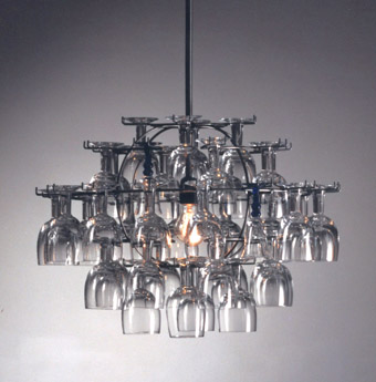Upside-down wine glasses make up this chandelier. The stemware is meant to be used and then rehung. By selecting which glasses to hang, you design your own chandelier. Different kinds of glasses create different reflections and light patterns. If you choose all crystal glasses, it will look like a crystal chandelier.