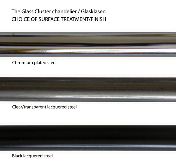 The 16 & 40 glass model are available in black or clear lacquered or chromium plated finish. The 76 glass model & 16 glass tea light model are available only in black lacquered finish.