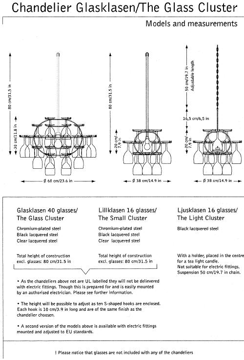 Order does NOT inlude: wine glasses, electrics (wiring) , bulb socket, bulb & canopy (ceiling plate). Chandeliers are prepared for wiring (excluding the Tea Light model) but do not include electrics. The rod comes with threading and washer mounted on its lower end and the electric fittings are easily assembled by an authorized electrician.