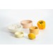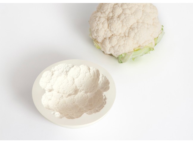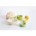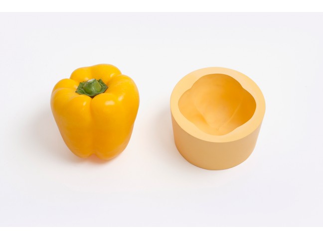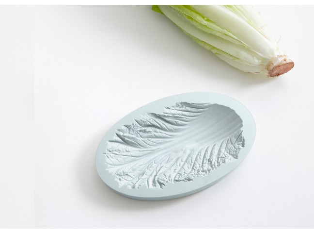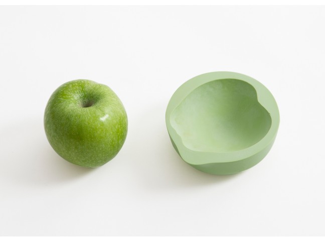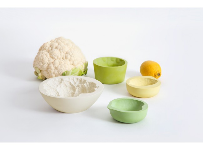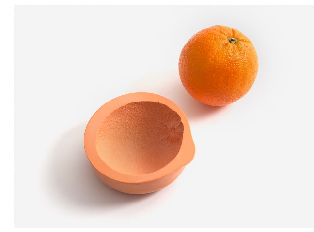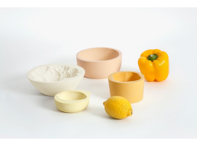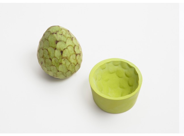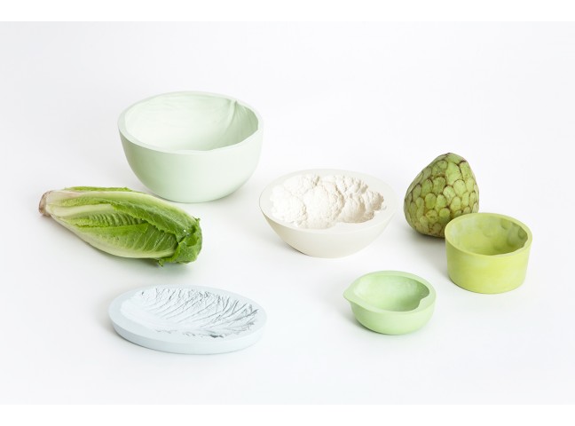 The space between a bowl and a fruit/vegetable is filled with casting material. Once dried, the filling material has adapted to the imprint of the container and represents the imprint of the different fruits/vegetables in a very detailed way. These imprints are then replicated as food-safe and water proof resin objects.