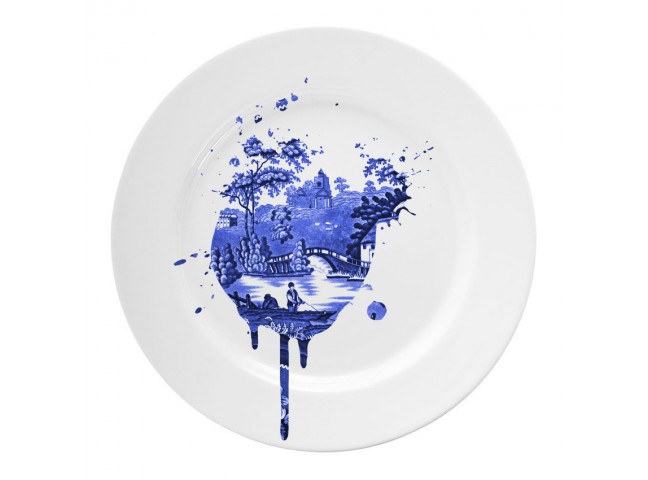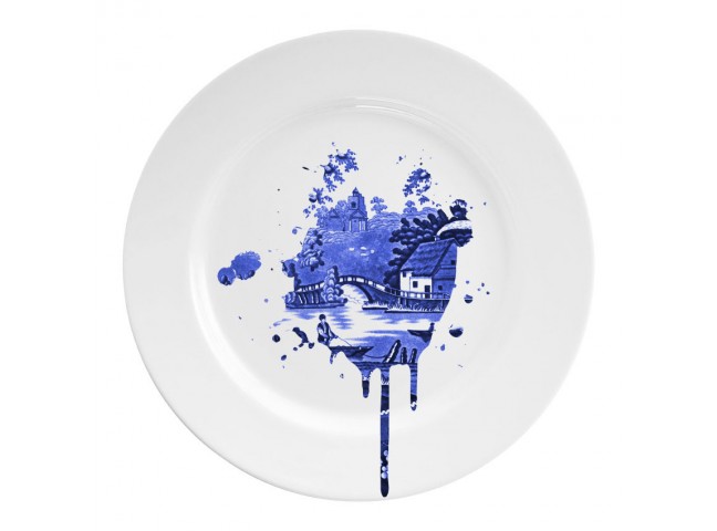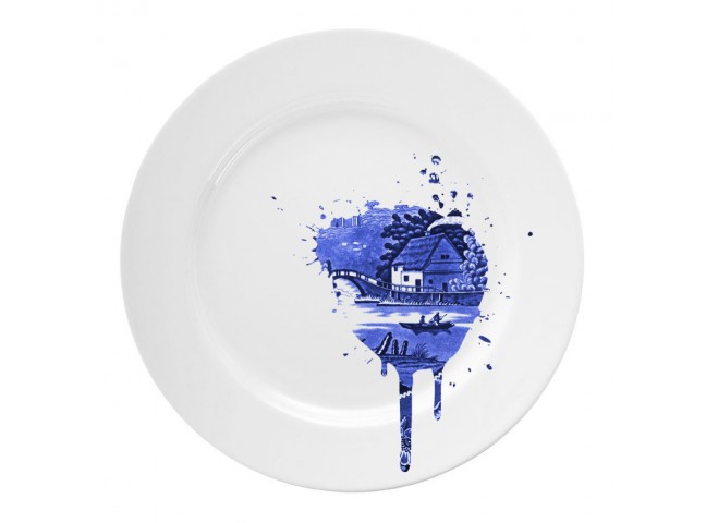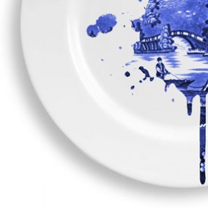 Young & Battaglia's Undercover Antiques Plates are a play on the traditional Dutch Delft blue ceramics. Each plate reveals a splatter of the familiar blue & white image on a glossy white ceramic background. The result is both surreal and very modern.