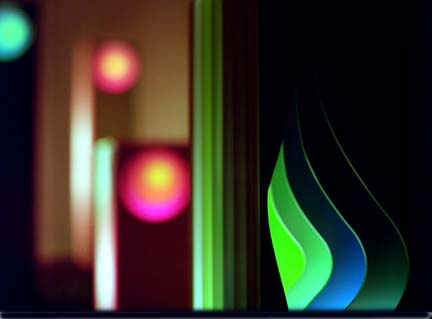 These glowing, organic pieces are made of white plastic panes, whose reverse sides are printed with vivid colors to reflect colored light onto the preceding planes (and, in the floor/table models, through the translucent enclosures as well).