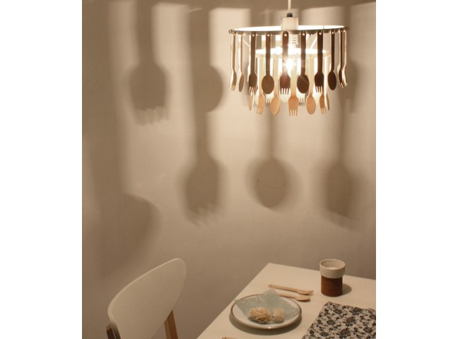 Gita is a pendant light for the kitchen, with wooden dining cutlery as the shade.