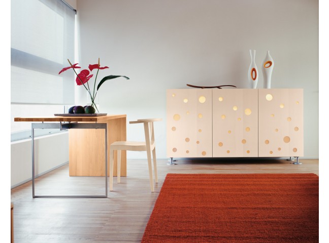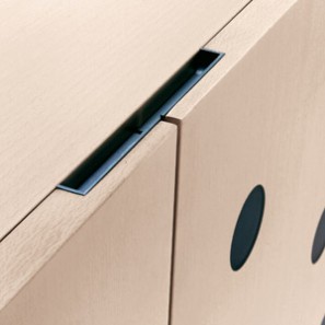 Doors with frosted methacrylate disc inserts. Frame and front in beech with 2 available finishes. Shelves made from transparent tempered glass, with polished edge, 5 mm thick. Internal lights.