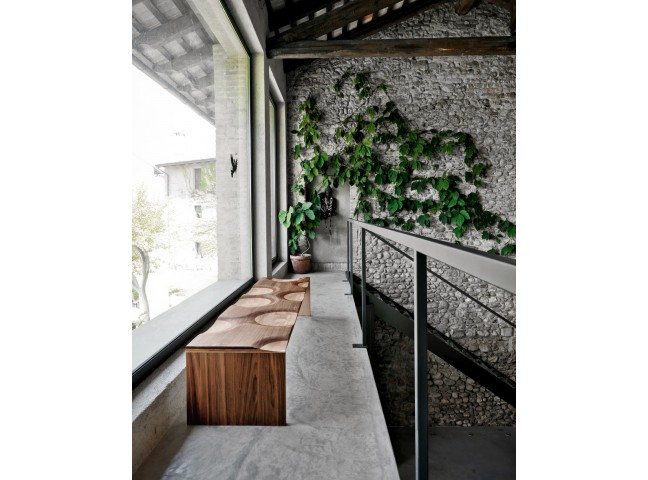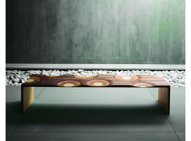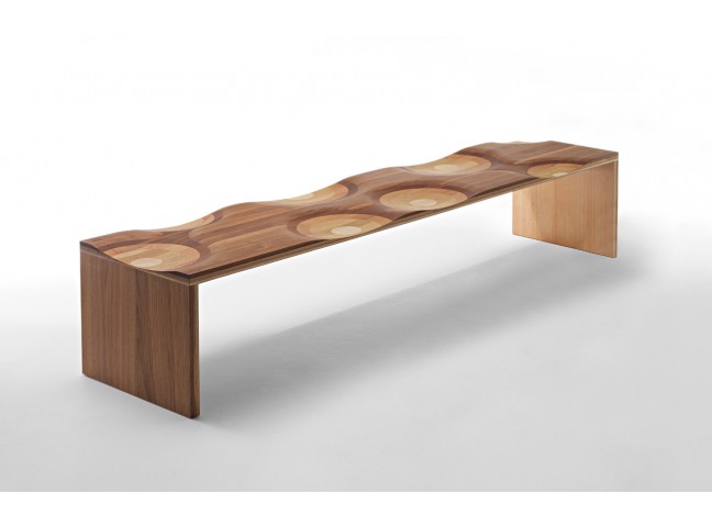 Five hardwoods - walnut, mahogany, cherry, oak and ash - are beautifully combined in the seat and finished with vegetable oil. With each circular ring of variable wood, there is a slight depression in the bench, creating the illusion of natural tree-rings... while also providing a very comfortable spot on which to rest.