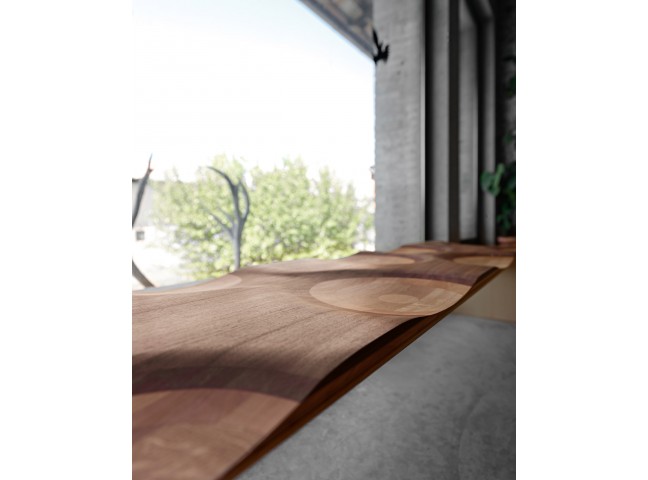 Available in indoor or outdoor model (made of okume plywood). Indoor version has plywood legs with edging and walnut veneer (on the outside), birch veneer (on the inside). Outdoor version features draining holes, and outdoor coating. Both versions have inner metal reinforcement.