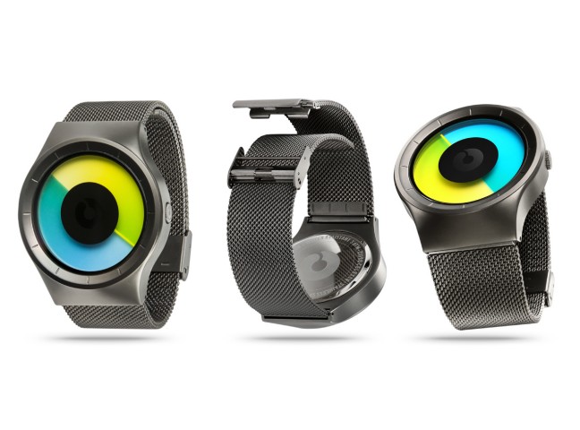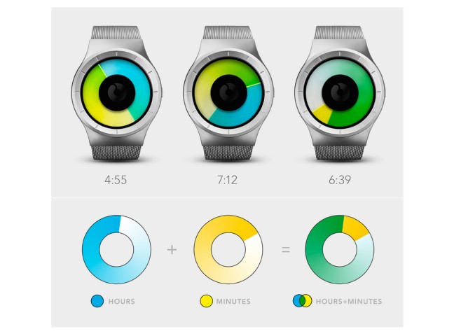 Celeste Watch tells the time with color and form. The watch face consists of two transparent coloured discs that represent the watch hands. When overlapped, they create a small spectrum of shades and colors, that let you know the time.