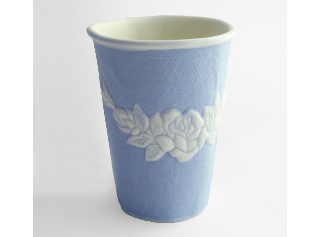 Cast in finest parian porcelain with blue stain and white relief detailing, these cups are not only beautiful, they're perfectly functional, suitable for hot and cold drinks.