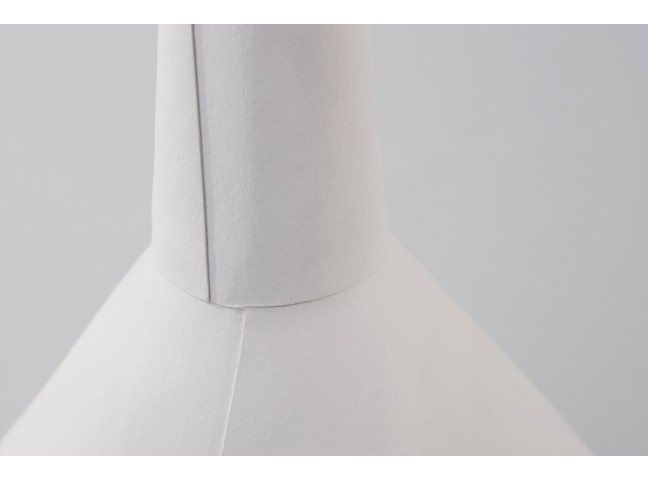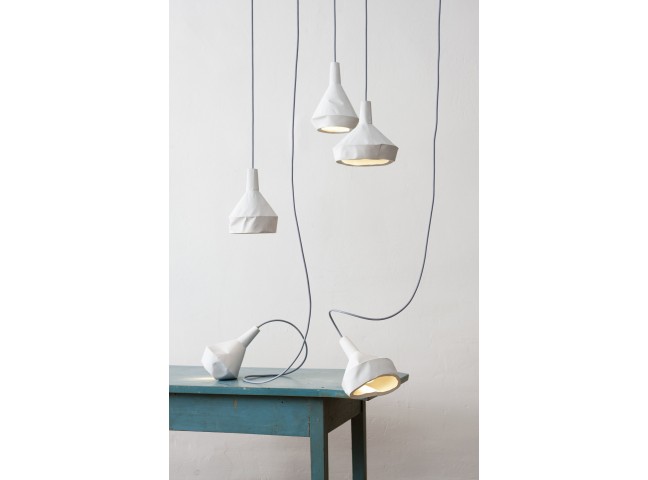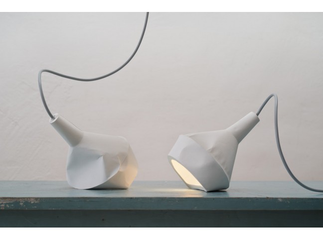 A clever twist on materials, Like Paper Pendant Lamp by Miriam Aust & Sebastian Amelung is cast in concrete, rotated to fling off excess material, rendering paper-like creases and folds.
