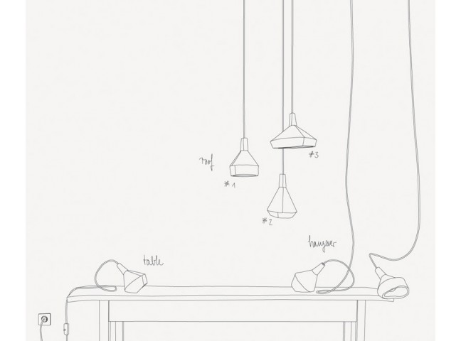 The "roof" models shine downwards by dangling from the ceiling, while "hangover" seems to lie exhausted on the table, the cabinet or the floor, emitting soft, diffused light.