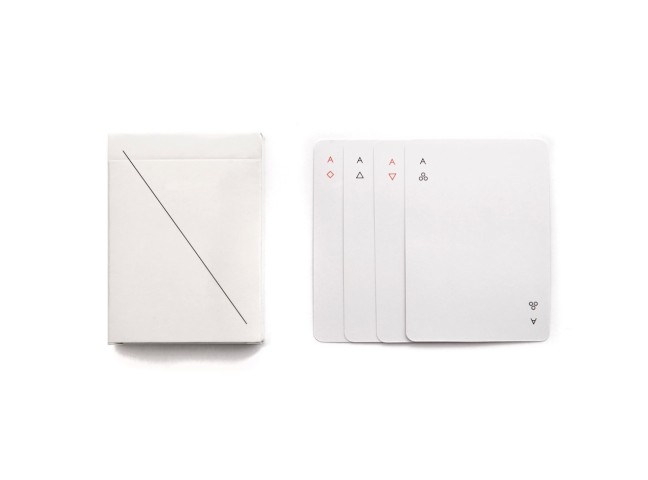 The traditional hearts, clubs, diamonds and spades are replaced with minimalist geometric symbols, and since regulation playing cards require that the backs be marked, Minim utilizes a minimal diagonal line instead of the typical ornamental graphics.