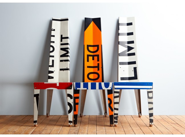 Made entirely of recycled street signs, these striking chairs look great around a kitchen table, or make a powerful statement on their own. Completely constructed, finished and sealed by hand.